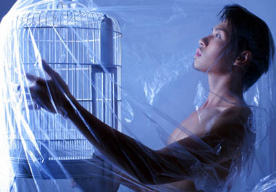| Phạm Đức Long diễn xuất cùng đạo cụ là chiếc lồng chim. |